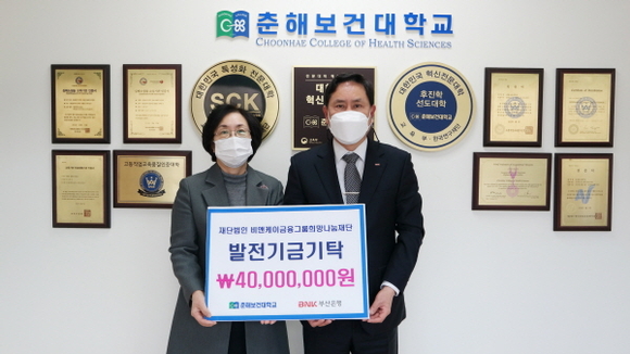 춘해보건대 김희진 총장(왼쪽)과 부산은행 박선호 상무(오른쪽)가 발전기금 전달식에서 기념촬영을 하고 있다. 15일 열린 대학발전기금 전달식에서는 BNK부산은행 박선호 상무, 춘해보건대학교 김희진 총장을 비롯한 양 기관 관계자들이 참석했다. (사진=춘해보건대 제공)