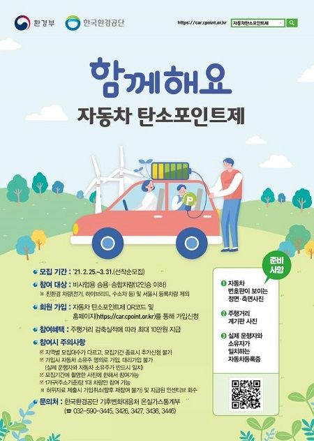 참여를 희망하는 경우 자동차 탄소포인트제 누리집에서 회원 가입 후 자동차 번호판 사진, 누적 주행거리 계기판 사진, 자동차등록증 사본을 제출하면 된다.