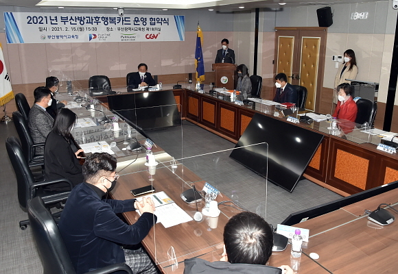 부산시교육청이 지난 15일 오후 시교육청 제1회의실에서 CGV, 풀무원푸드앤컬처 등 8개 기업과 ‘부산 방과후행복카드 제휴 협약’을 체결했다고 16일 밝혔다.
