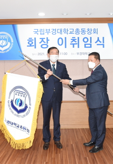 정용표 전임회장(오른쪽)이 이승철 신임회장(왼쪽)에게 부경대학교 총동창회기를 전달하고 있다. (사진=부경대 제공)
