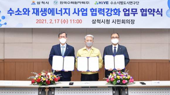 한국수력원자력(이하 한수원)이 17일 삼척시청에서 삼척시, 수소시범도시 인프라 기술개발 연구단과 수소산업 활성화를 위한 ‘수소 및 재생에너지 사업 협력 업무협약(MOU)'을 체결했다.