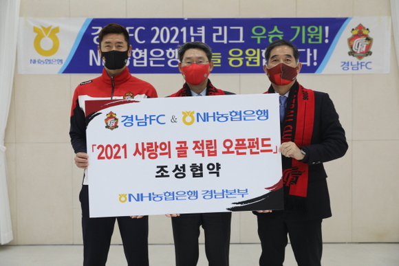 NH농협은행 경남본부는 지난 17일 남해스포츠파크를 찾아 경남FC 선수단을 격려하고, 경남FC와 ‘2021 사랑의 골 적립 오픈펀드’ 조성 협약식을 가졌다고 밝혔다.