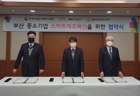 부산지방중소벤처기업청(부산중기청)과 (재)부산테크노파크, ㈜포스코ICT가 17일 부산중기청에서 ‘부산 소재 재조 중소기업 스마트 공정 혁신 협력 협약’을 체결했다고 밝혔다.