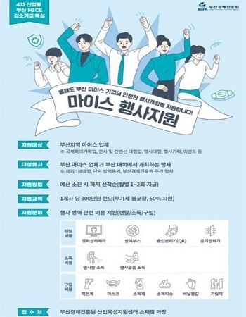 부산경제진흥원 관계자는 “단계별 방역절차가 수립되고 갈수록 방역이 강화함에 따라 면대면 비즈니스를 영위하는 마이스 업계에 방역비용은 큰 부담이었다”며 “코로나19 사태로 유례없는 위기를 겪는 마이스 기업의 비용부담을 줄이고 안전한 행사 개최 지원을 위해 보다 적극적으로 지원할 것”이라고 전했다.