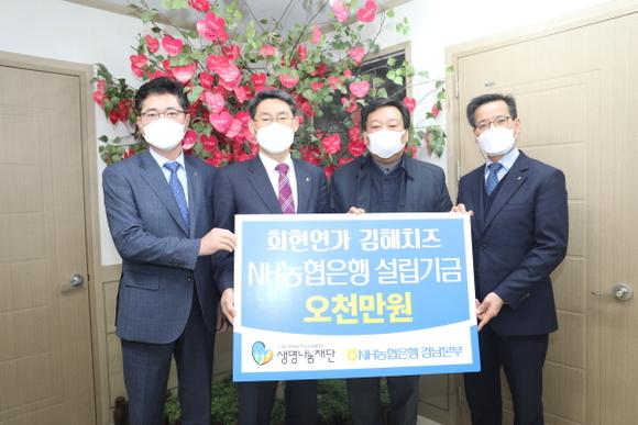 NH농협은행 경남본부는 18일 김해 생명나눔재단을 찾아 ‘회현연가 김해치즈’ 설립기금 5000만원을 사회적기업인 회현연가 협동조합에 전달했다고 밝혔다.