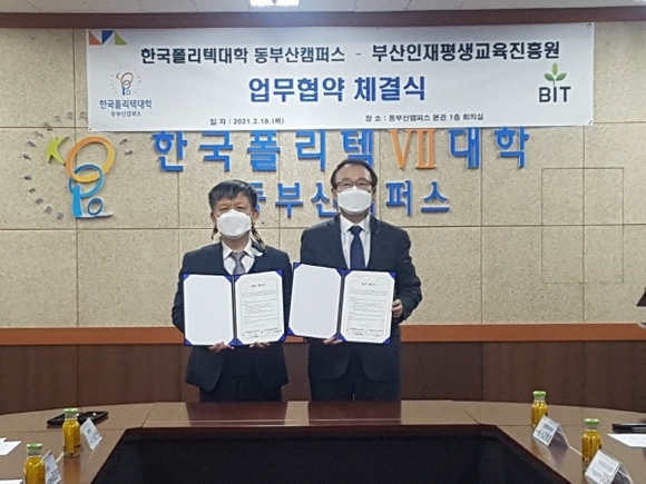 한국폴리텍대학 동부산캠퍼스는 18일 캠퍼스 본관 1층 회의실에서 부산인재평생교육진흥원과 업무협약 체결식을 진행했다고 밝혔다.