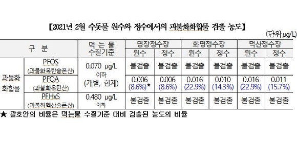 이번에 검출된 과불화옥탄산은 정수장의 원수와 정수된 수돗물에서 검출된 것으로 먹는 물 수질기준인 0.070㎍/ℓ 이하의 8.6~22.9% 수준이다. 이에 대해 시 상수도본부는 인체에는 무해한 정도라고 설명했다.