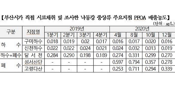 이에 시는 주기적으로 낙동강 중상류 주요 지점의 수질을 지속해서 관찰하고 있다는 입장이다. 부산시상수도본부 관계자는 “특히 갈수기에는 그 농도가 증가한다”며 “올겨울 강수량이 적고 상류보와 댐의 방류량이 예년보다 적어 이번 과불화옥탄산 검출에도 영향을 미쳤을 것”이라고 분석했다.