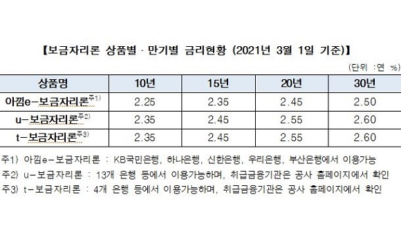 또 전자약정 등 온라인으로 신청해 비용을 절감할 수 있는 ‘아낌e-보금자리론’은 0.10%p 낮은 연 2.25%(만기 10년)에서 최대 2.50%(30년)의 금리가 적용된다.