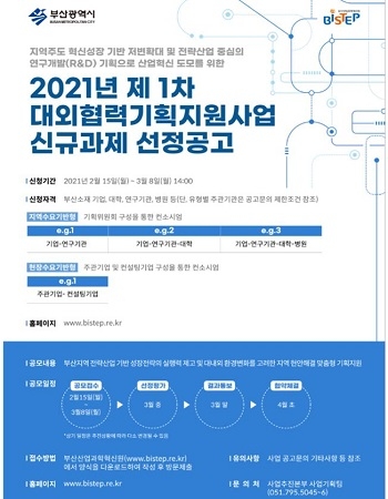 부산산업과학혁신원(BISTEP)과 부산시가 ‘2021년도 제1차 대외협력기획지원사업’을 시행해 공모 접수를 내달 8일까지 받는다고 23일 공고했다.