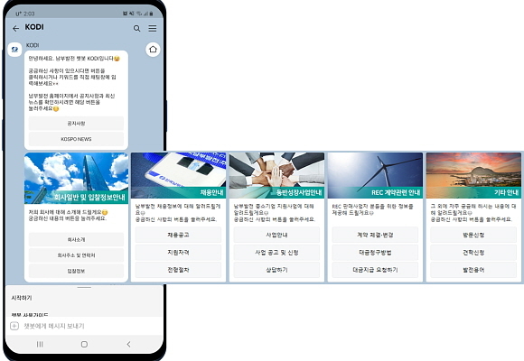 이에 이용자들은 KODI 카톡 채팅창에 필요 정보에 대한 단어나 질문을 입력하면 답변을 바로 얻거나 관련 사이트로의 연결 또는 상담을 받을 수 있다. 이 KODI 챗봇은 카카오톡 친구 검색창에서 ‘남부발전 챗봇’을 검색해 채널을 추가한 뒤 채팅 서비스로 이용할 수 있다.