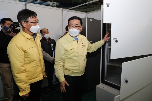 허성무 시장은 이날 오후 3시 경남도 우선 지역예방접종센터가 설치되고 있는 마산실내체육관을 찾아 코로나19 백신 예방접종 준비 상황을 점검했다.