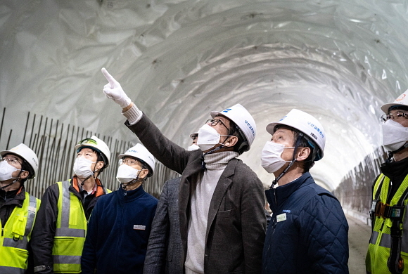 박형준 부산시장 예비후보(국민의힘)가 지난 23일 오후 부산도시철도 사상~하단선 5공구 건설 현장을 방문해 공사 근로자들에 안전을 당부하며 대중교통 중심 도시 조성을 다짐했다.