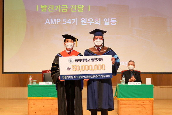이날 수료식에서 AMP 54기 수료생 52명이 수료증을 받았으며, 황소용 54기 원우회장을 비롯한 원우 일동은 대학 발전기금 5000만원을 전달했다.