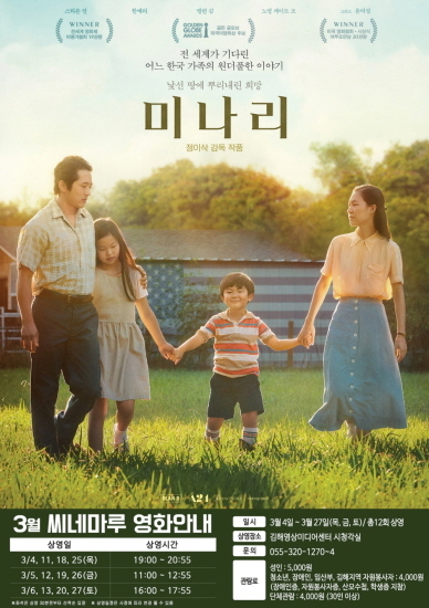 영화 ‘미나리’는 오는 3월 4일부터 27일까지 매주 목·금·토요일 총 12회 상영된다. 자세한 일정은 김해문화의전당 영상미디어센터 홈페이지에서 확인할 수 있다.