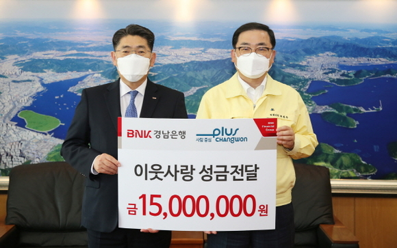 BNK경남은행은 24일 창원시에 ‘이웃사랑 성금’을 기탁했다. 이날 김백용 상무는 창원시청을 방문해 허성무 시장에게 ‘이웃사랑 성금 증서’를 전달했다.