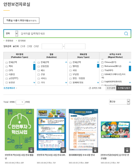 공단 관계자는 “산업재해 예방을 위해서는 사업장의 특성에 맞는 안전보건 교육이 중요하다”며 “안전보건자료실과 안전보건 아카이브 서비스를 통해 사업장에서 필요한 교육 자료를 쉽게 찾고 다양하게 활용하길 기대한다”고 밝혔다.
