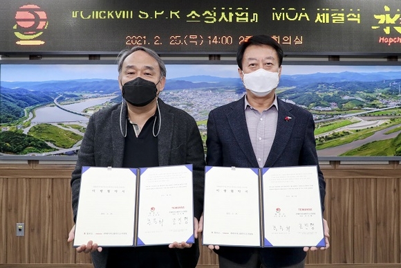 경남 합천군은 25일 군청 회의실에서 (주)테마파크를 만드는 사람들(TEMANSA) 조진형 대표이사와 문준희 군수가 참석한 가운데 '클릭빌 미디어스튜디오 테마파크 리조트(클릭빌SPR)' 프로젝트에 대한 투자이행협약(MOA)를 체결했다.
