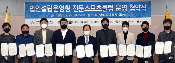김석준 부산시교육감(중앙)이 지난 25일 오후 부산시교육청 제1회의실에서 8개 법인설립운영형 전문스포츠 축구클럽 대표와 ‘학교 운동부 운영 협약’을 체결하고 기념촬영하고 있다.