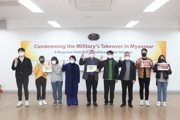 부산외국어대학교 동남아시아학부 및 아세안연구원 연구자 모임은 지난 25일 오후 3시 30분 대학본부 내에 설치된 아웅산 수치홀에서 미얀마 군부 쿠데타 중단을 요구하는 내용을 담은 ‘미얀마 민주주의 회복과 평화를 위한 부산외국어대학교 동남아연구자 성명서’를 발표했다.