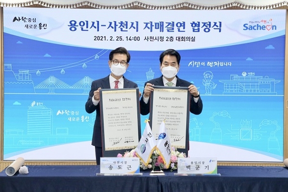 경남 사천시와 경기 용인시가 25일 사천시청 대회의실에서 상생 발전과 공동 번영을 위한 자매결연 협약을 체결했다.