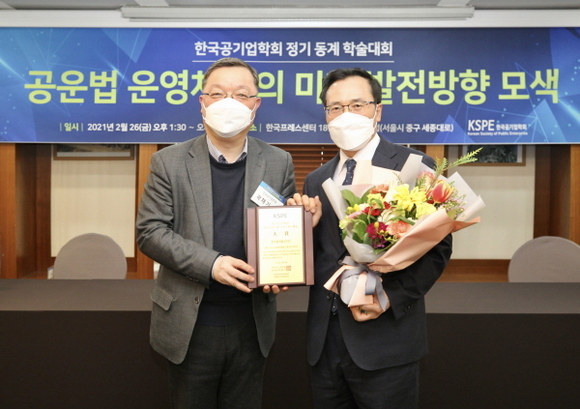 홍동표 한국동서발전 재생에너지처장(오른쪽)이 2020년도 ‘공공기관서비스혁신대상’ 에서 회사대표로 대상을 수상한 후 곽채기 한국공기업학회장(왼쪽)과 기념촬영을 하고 있다. (사진=동서발전 제공)