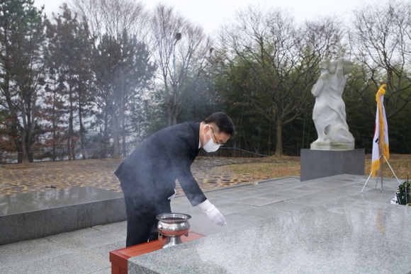 권순기 총장이 충혼탑에서 분향하고 있다. (사진=경상국립대 제공)