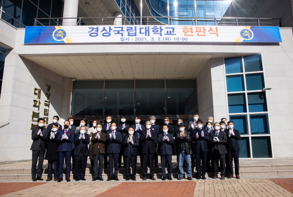 경상국립대학교는 3월 2일 오전 10시 칠암캠퍼스 대학본부 1층에서 ‘소통과 화합의 현판 제막식’을 개최했다. 현판식에 참석한 내빈들이 기념촬영을 하고 있다. (사진=경상국립대 제공)