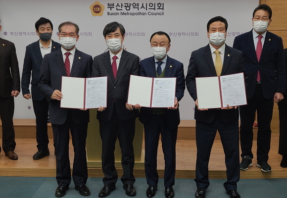 하태경 국민의힘 부산시당위원장과 이번에 당적을 국민의힘으로 옮기는 이산하 시의원, 조병길 사상구의회 의장, 박우식 기장군의원 등은 오늘 시의회에서 기자회견을 열고 위와 같이 발표했다. 이 자리에서 이 세 명의 의원들은 입당 서명서에 사인했다.