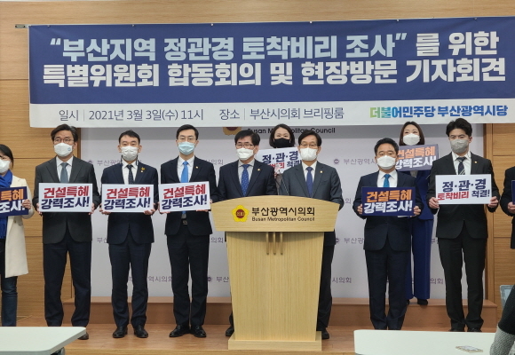 부산시의회 건설특혜위법성의혹행정사무조사특별위원회(특위)가 3일 오전 11시 시의회 브리핑실에서 기자회견을 열고 경찰청과 국세청 등 수사 관련 기관에 전봉민 국회의원의 이진베이시티 관련 불법성 조사 돌입을 촉구하고 나섰다.