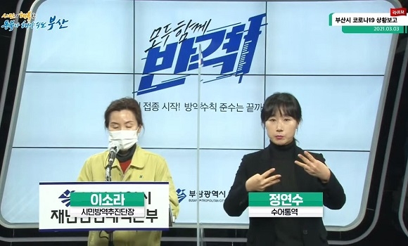 이어 환자 지표 분석 결과와 백신 접종 현황에 대해 발표했다. 이소라 단장은 “최근 일주일간 총 확진자는 84명으로 일일 평균 확진자 수는 12.0명으로 지난주 15.3명에 비해 감소했다. 또 최근 일주일간 감염 재생산지수는 0.57로 지난주 0.73에 비해 다소 떨어졌다”며 “백신 접종 상황은 지난 2일 오후 10시까지 일일 접종인원 6468명에 대한 1차 접종을 마쳐 부산지역 누적 접종인원은 7270명으로 집계된다. 현재까지 ‘중증 이상반응’ 등 특이사항은 보고되지 않았다”라고 전했다.