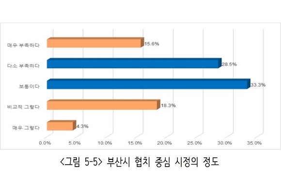 부산 협치 시정의 부정적 분야로는 ‘공직사회 내 협치 인식 부족’이 45.1%의 응답률로 가장 높았다. 이어 ‘자문 중심의 형식적 참여 구조(22%)’, ‘행정 내 협치 정신 구현할 시스템 부재(13.4%)’가 뒤를 이었다.