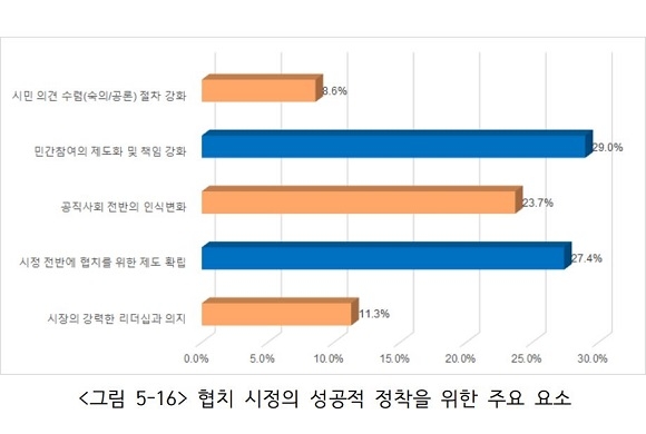협치 시정의 성공적 정착을 위해 가장 중요한 요소로는 ‘민간 참여의 제도화와 책임 강화가 19.0%의 응답률로 가장 높았다. 이어 ’시정 전반에 협치 위한 제도 확립(27.4%)‘, ’공직사회 전반의 인식 변화(23.7%)‘ 등의 순으로 나타났다.