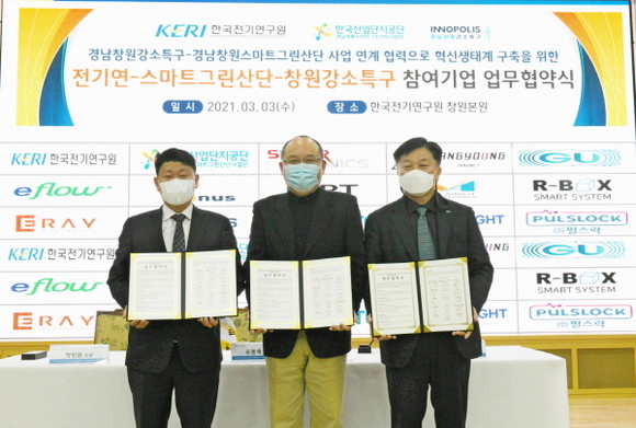 한국전기연구원(KERI)과 경남창원스마트그린산단이 창원 강소특구에 참여하는 13개 기업과 유대관계 강화를 위한 상호협력 협약을 3일 오후 연구원 창원본원에서 체결했다.