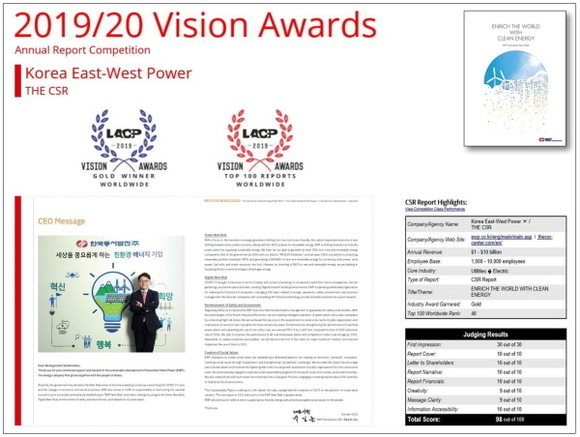 한국동서발전은 미국 마케팅 전문기관인 커뮤니케이션 연맹(LACP)에서 주관하는 ‘비전 어워드’의 ‘2020 지속가능경영보고서’ 부문에서 금상(Gold Winner)을 수상했다고 4일 밝혔다.