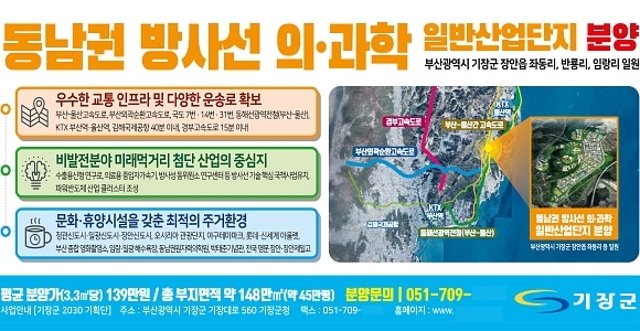 부산 기장군이 동남권 방사선 의·과학 일반산업단지(산단)의 1단계 산업시설용지 분양공고를 5일 내고 오는 8~11일까지 분양 접수를 진행한다고 밝혔다.