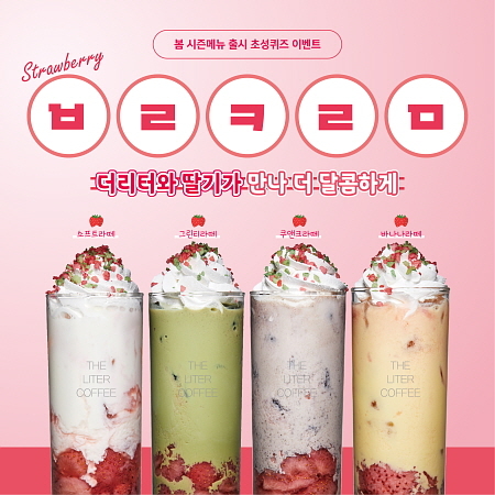 더리터는 첫 다섯 글자의 초성을 보고 정답을 맞추는 고객 중 추첨을 통해 더리터의 봄 신메뉴인 딸기라떼 4종 가운데 1종의 쿠폰을 증정한다.