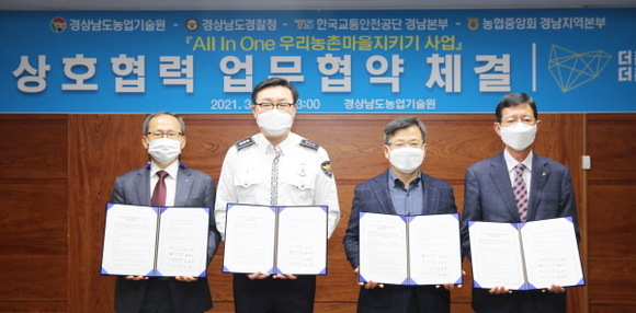 경남농협은 8일 경남농업기술원 본관 회의실에서 경남농업기술원, 경남지방경찰청, 한국교통안전공단 경남본부와 농촌지역 교통사고 예방을 위한 ‘All In One 우리농촌마을 지키기 사업 업무협약’을 체결했다.