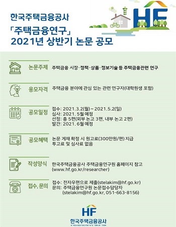 주금공 관계자는 “공모전에 대한 더 자세한 내용은 주금공 주택금융연구원 홈페이지에서 확인할 수 있다”며 “기타 궁금한 사항은 주택금융연구원 대표전화로 문의하면 된다”고 안내했다.