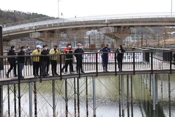 삼성천 현장에서 오 군수는 “부산도시공사에서 조성해 놓은 삼성천 산책로 구간이 단절돼 있다”며 “이 구간을 연결하고 산책로를 조성할 땐 반드시 유모차가 지나갈 수 있도록 배려해 추진하라”고 지시했다.