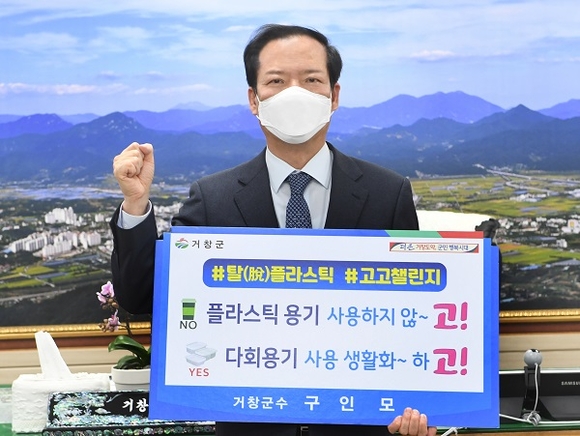 구인모 거창군수는 9일 환경부가 주관하는 생활 속 플라스틱 줄이기 릴레이 캠페인 탈(脫) 플라스틱 '고! 고! 챌린지'에 동참했다.