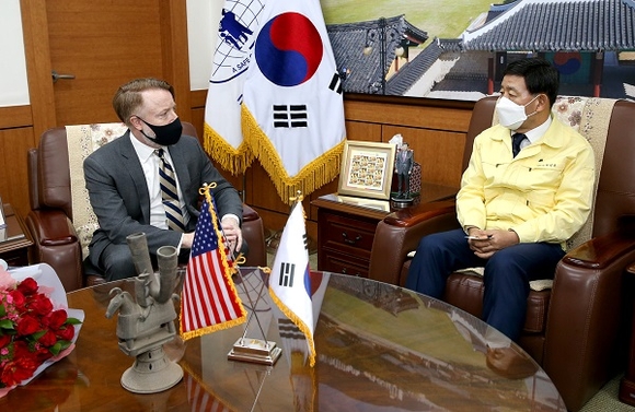 허성곤 김해시장은 9일 시청 접견실에서 고든 처치 주부산미국영사와 코로나시대 김해시와 주부산미국영사관 간 상호교류 및 협력방안에 대해 논의하는 시간을 가졌다.