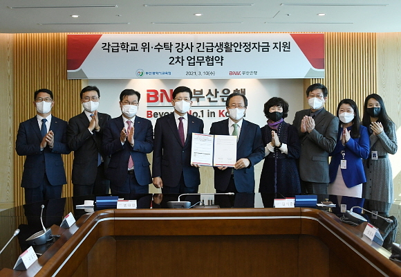 이날 오후 부산은행은 본점에서 부산시교육청과 ‘각급 학교 위·수탁 강사 긴급생활안정자금 2차 지원 시행’ 협약을 체결했다.