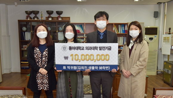 지난 10일 오전 동아대 구덕캠퍼스 의과대학 학장실에서 열린 발전기금 전달식에는 박환태 학장과 김대경 대외협력처장, 김희진·김미정 자매 등이 참석했다.