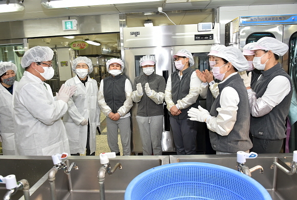 김석준 부산시교육감이 신학년도 개학을 맞아 지난 10일 오전 동래구 소재 안남초등학교를 방문해 급식실 위생 상태 등을 점검하고 있다. (사진=부산시교육청 제공)