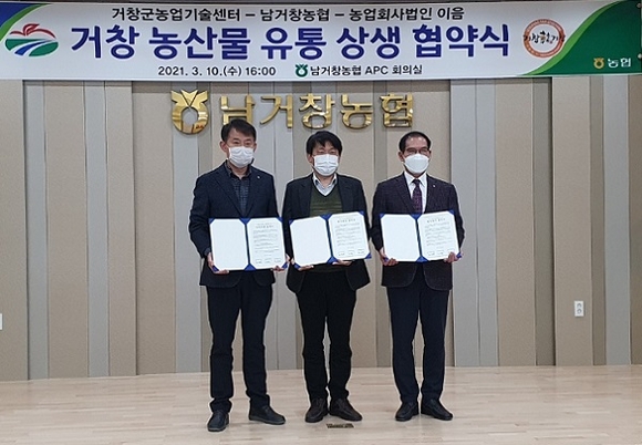 경남 거창군 농업기술센터는 거창 농특산물 유통 활성화를 위해 지난 10일 남거창농협 APC 2층 회의실에서 농업회사법인 이음·남거창농협과 3자 상생 협약을 가졌다.