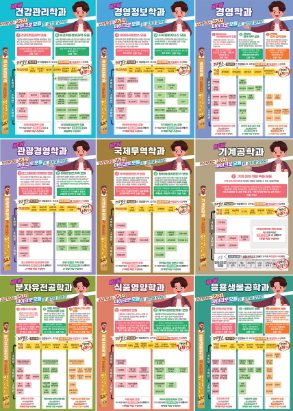 현재까지 개발된 모듈은 △분자유전공학과 ‘식물바이오엔지니어링’ 등 3개 △응용생물공학과 ‘곤충산업’ 등 3개 △기계공학과 ‘기계설계역량특화’ 등 1개 △경영학과 ‘Business Management’ 등 3개 △관광경영학과 ‘호스피탈리티운영관리’ 등 2개 △국제무역학과 ‘환위험관리전문가’ 등 2개 △경영정보학과 ‘데이터사이언스’등 2개 △식품영양학과 ‘지역사회영양케어’ 등 2개 △건강관리학과 ‘건강&운동과학’ 등 2개를 포함해 모두 9개 학과 20개다.