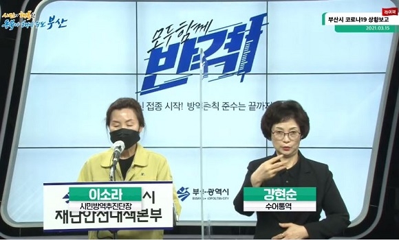 이소라 시민방역추진단장은 “현재 집단격리 중인 서구 삼육병원과 서구 선박, 부산진구노인장애인복지관에서는 지난 14일 조사에서 추가 확진자가 나오지 않았다. 부산 내 위중증 환자는 9명으로 분류되고 있다”며 “백신 접종 상황은 지난 14일에는 일일 접종을 시행하지 않아 어제 기록인 누계 4만 5897명과 접종률 72.8%를 그대로 유지했다. 어제 이상반응 신고 건은 3건으로 모두 발열, 근육통 등의 증상을 호소했다”고 설명했다.