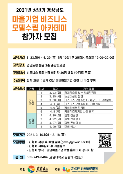 경남대학교 공동체지원단이 오는 18일까지 경남도민을 대상으로 ‘경남 마을기업 비즈니스 모델수립 아카데미’ 참가자를 모집한다.