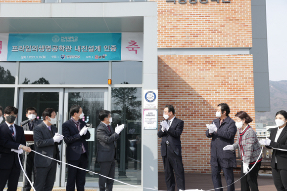 인제대학교 프라임의생명공학관이 김해에서 최초로 행정안전부의 지진 안전시설물 인증을 획득했다.